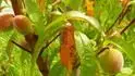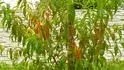 Na tříletých broskvích se nyní objevují červené listy s typickou kresbou. Jsou to zejména listy uvnitř koruny, letošní přírůstky jsou naprosto nezasažené. Poslední dny poškozené listy začaly padávat. Plody nejeví známky jakéhokoliv poškození. Loni jsme toto nepozorovali. Ztrátu listů odhaduji na cca 15-20%.