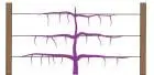 taham na drotenke na 3 poschodia 60-120-180, takze pri zapestovani "vhodne" vyhony v lete neskracujem ale vyviazem ich ako nove ramena pripadne predlzenie ramien. Ked som kiwi sadil malo uz tri vyhony, takze dva som pouzil ako kordony (ramena) prveho poschodia a treti kolmo hore na dalsie poschodie. V zime som ich o 1/3 zakratil a na jar nasledujuceho roka na ramenach vybral posledne vyhony ako pokracovanie a na kolmo rastucom vyhone posledne tri, zase do stran a hore.