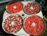 Pokud jde o ten videoklip, tak tam se rajčata nesuší, ale pečou. Pokud jsem dobře slyšel tak na "two hundred degrees" (200 °C). Já suším na slunci, když se zhorší počasí dosouším v troubě na sítech při cca 70°C metodou per partes (zahřeji na teplotu, chvíli nechám, otevřu na škvíru a nechám vychladnou). Jdu kolem trouby zapnu a tak to dělám doku nedosuším.Počítám, že zrovna teď bude počasí vhodné k sušení na slunci.